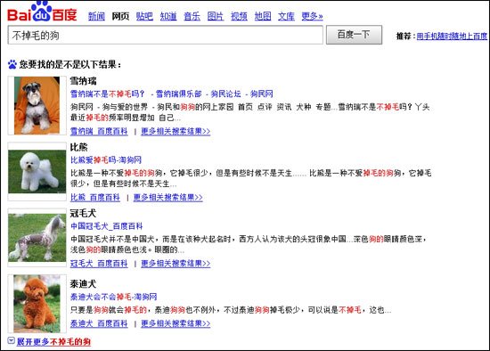 如在百度搜索框中輸入“不掉毛的狗”,搜索結果中最先出現的不再是文字連接,而是特點的動物,除雪納瑞等較為常見的不易掉毛的狗外,甚至可以覆蓋到冠毛犬。